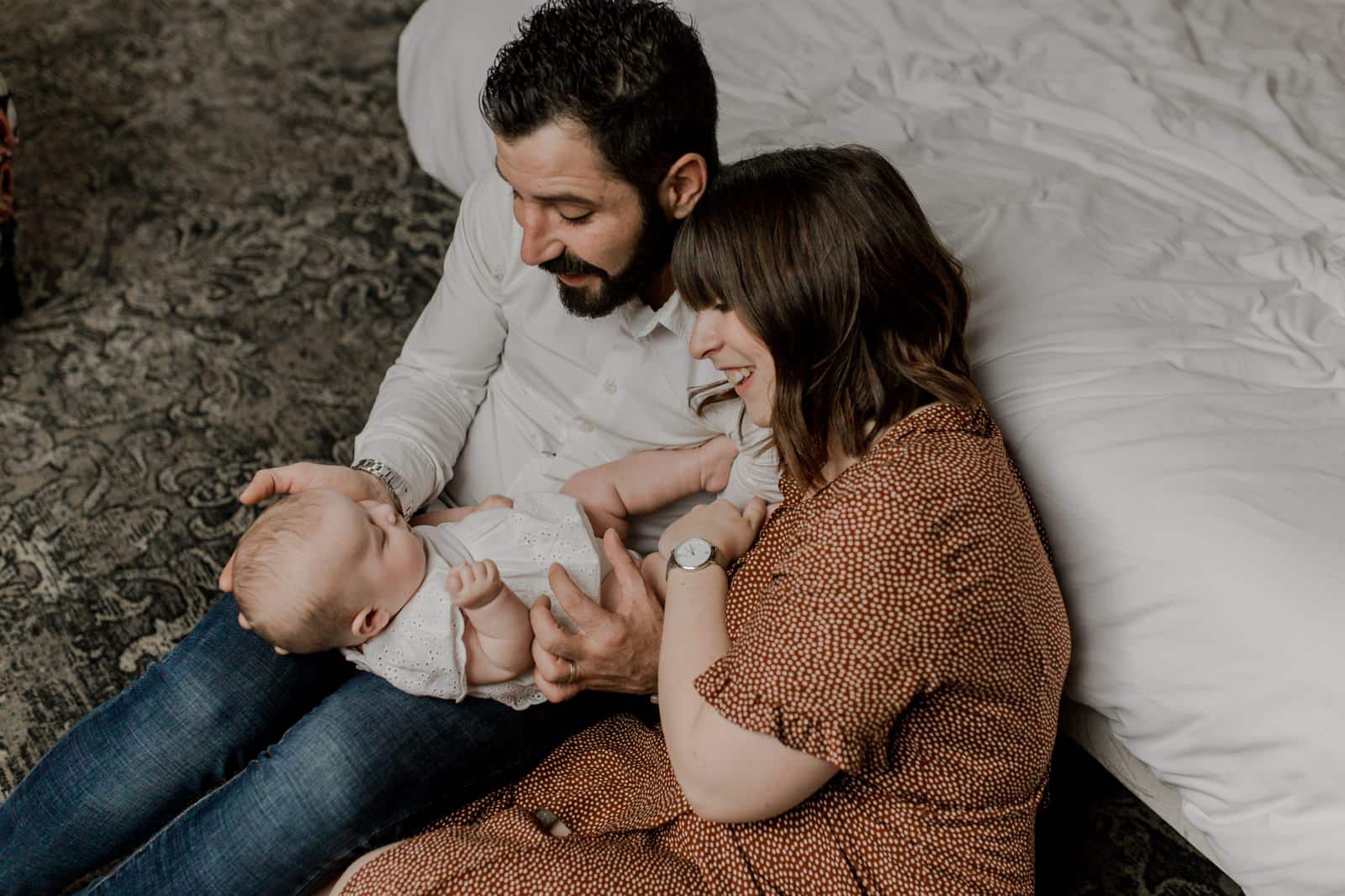 Anaïs m’a contactée pour une séance famille “lifestyle” avec son bébé de 3 mois dans une jolie chambre d’hôte, au Clos Saint Martin. J’ai beaucoup aimé ce projet parce qu’il représente tout ce que j’apprécie dans mon métier ! J’aime ces séances photos de famille où le bébé est plus éveillé, où de jolies expressions sont présentes. Ce sont les premiers vrais échanges, les premiers sourires. La chambre qui nous a accueillis était pleine de charme. Les propriétaires ont choisi la décoration avec soin, dans l’air du temps. Cet espace formait comme un cocon de douceur pour nous accueillir pendant quelques heures.  Lors d’une séance en famille, il est important de créer une intimité dans laquelle vous vous sentez à l’aise, surtout lorsque cela n’a pas lieu chez vous. Cela vous permet d’être détendus et de montrer votre personnalité, individuellement et ensemble. Le plus important est de rester vous-même, de lâcher prise. C’est comme cela que nous obtiendrons le meilleur résultat avec des photos authentiques. De plus, c’est un vrai souvenir pour vous et votre famille que vous pourrez transmettre aux générations futures.